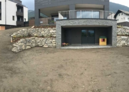 Bei diesem Neubau haben wir die Böschungen mit Trockenmauern abgefangen. Als Steine verwendeten wir vorwiegend heimischen Granit. Durch die Mauern entstanden Pflanzflächen die einerseits mit Zierpflanzen aber auch für Beeren und Kräuter bepflanzt wurden. Eine Treppenanlage aus Granit verkürzt viele Wege.