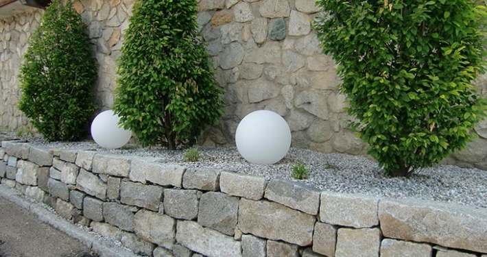 Durch Trockenmauern, die mit schichtigen Granitblöcken ausgeführt wurde, ist es gelungen verschiedene Ebenen zu schaffen.Diese wurden mit Eiben-Kugeln und Ziergräsern bepflanzt. Auch ein Beleuchtungskonzept wurde mit dem Elektriker umgesetzt. Mit Kugelleuchten, die in Kombination mit den Formgehölzen stehen, wird der Bereich auch in den Abendstunden aufgewertet.